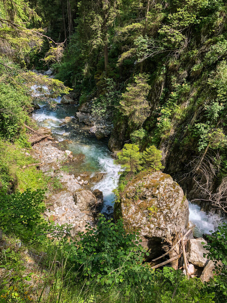 Die Gilfenklamm mit Kindern zu wandern ist ein echtes Erlebnis. In der Schlucht selbst verläuft der 2,5 Kilometer lange Weg super spannend über Stege, Brücken und Treppen, durch einen engen Marmor-Tunnel und zu spektakulären Aussichtspunkten. Immer direkt neben oder über dem Wasser und inmitten der imposanten Felsenwände.