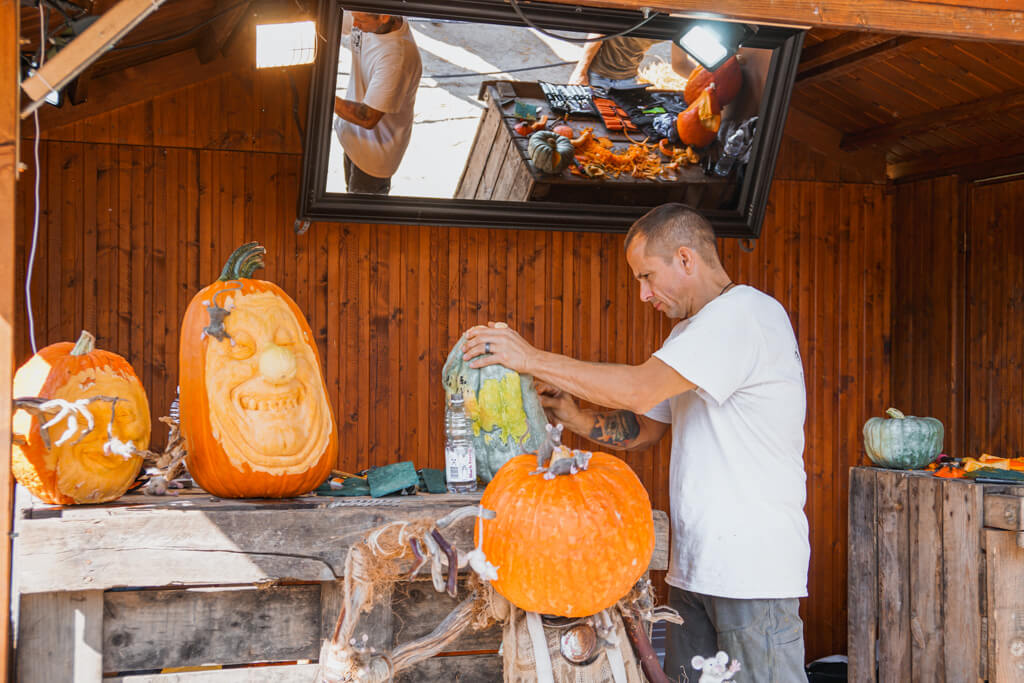 Während unserem Besuch 2018 konnten wir einem bekannten Kürbis-Kunstschnitzer aus den USA über die Schulter schauen, der an diesem Wochenende seine Fertigkeiten präsentierte. Auch 2024 sind wieder internationale Schnitzkünstler zu Gast.