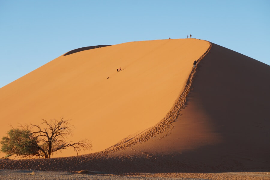 Weiter geht´s zur Düne 45 – eine von vier Dünen, die man im Nationalpark besteigen darf. Zum Glück ist es immer noch früh, sonst wäre das Raufkraxeln bestimmt eine schweißtreibende Angelegenheit. Obwohl schon vereinzelte Autos hier parken, sind wir noch immer recht einsam und genießen die Stille auf dem Kamm der Düne. Unglaublich, dass wir jetzt wirklich hier stehen – auf den höchsten Sanddünen in einer der ältesten Wüsten der Welt!