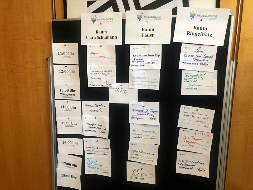 Die Barcamp Sessions behandelten Themen wie Cookie-Banner und Datenschutz, Suchmaschinenoptimierung und Geld verdienen, technisches Bloggerwissen und Soziale Medien. Aber auch die Verantwortung von Reisebloggern beim Thema Nachhaltigkeit und die Frage nach der Authentizität trotz bezahlter Kooperationen wurden diskutiert.